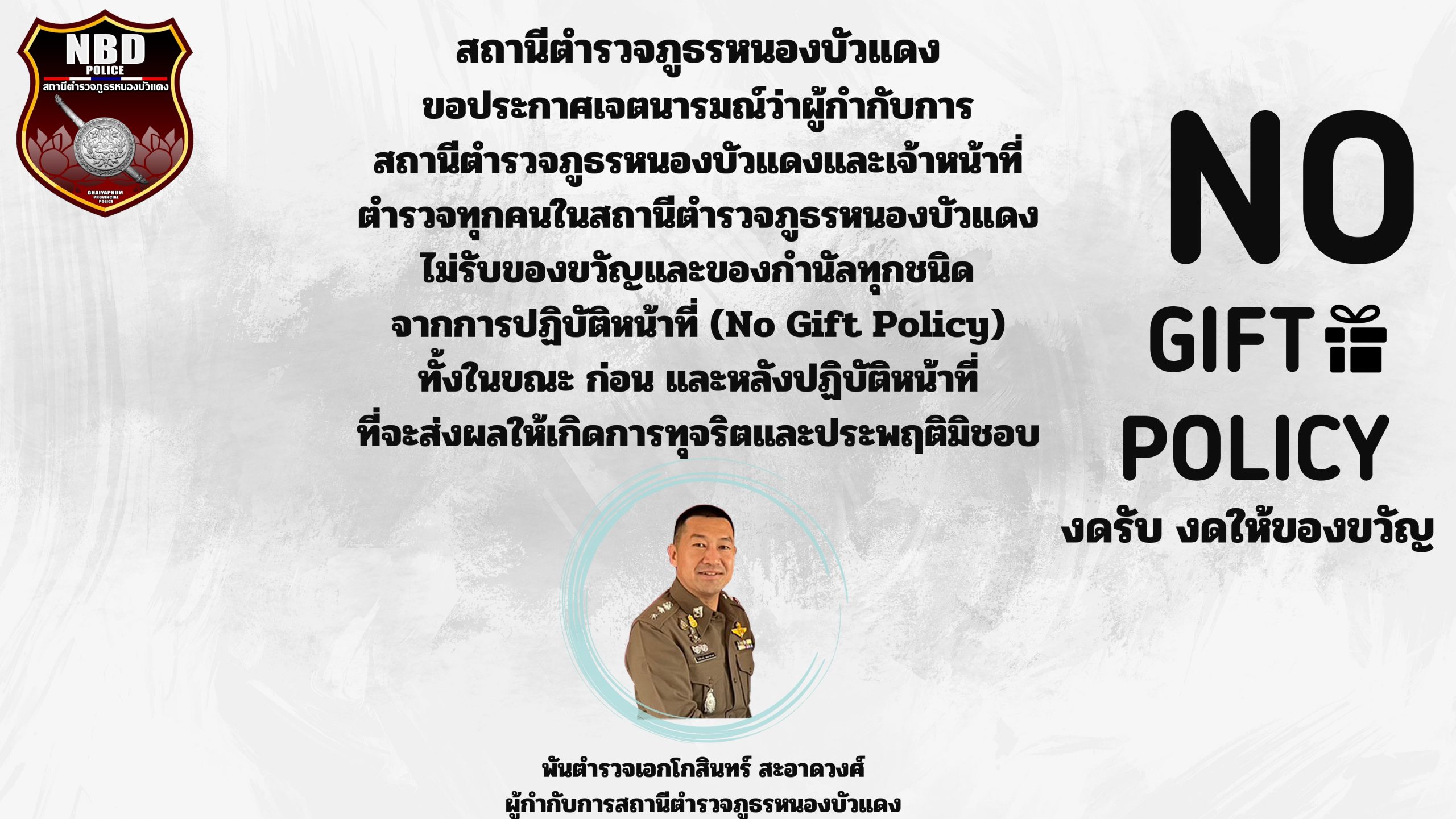 - ประกาศสำนักงานยุทธศาสตร์ตำรวจเรื่องเจตนารมณ์ที่จะไม่รับของขวัญหรือของกำนัลทุกชนิดจากการปฏิบัติหน้าที่